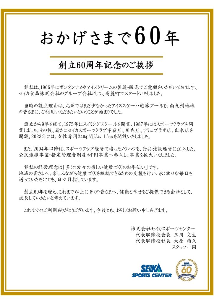 | 1966年 | 鹿児島市高麗町に(株)セイカスポーツセンター設立。県内初の屋内スケート場と屋内・屋外プール場を開設 |